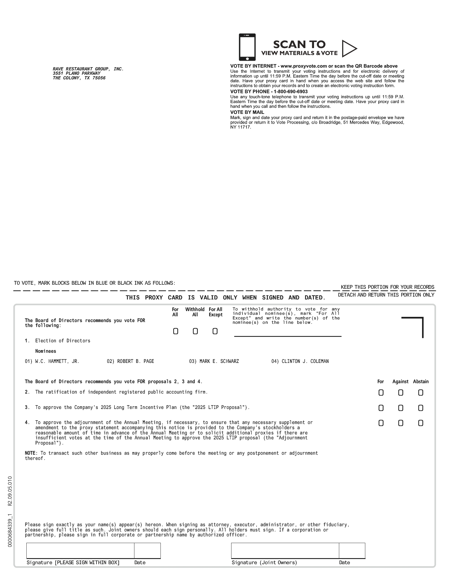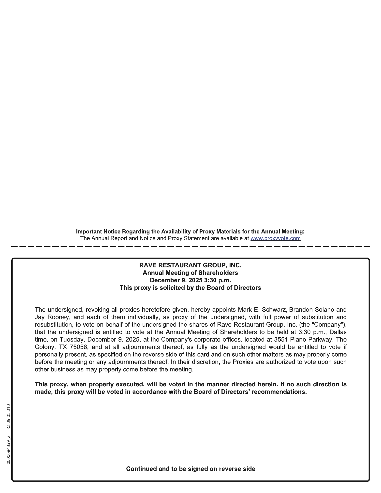 We are pleased to invite you to the Annual Meeting of Shareholders of RAVE Restaurant Group, Inc. to be held at the company’s corporate offices, located at 3551 Plano Parkway, The Colony, Texas 75056, on Tuesday, December 9, 2025, at 3:30 p.m., local time.